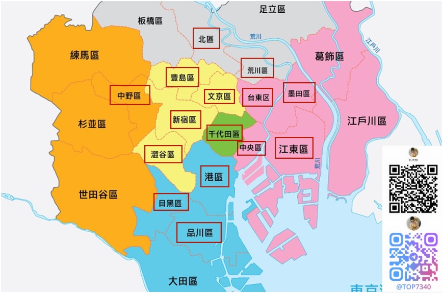 荒川区、北区、墨田区、台東区、江東区、豊島区、文京区、千代田区、中央区、新宿区、港区、中野区、渋谷区、目黒区、品川区